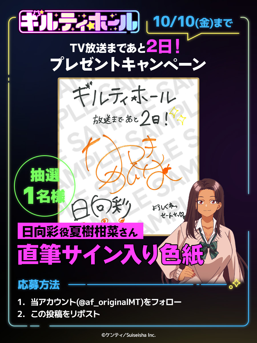 公式X(旧Twitter)では、TV放送まであと2日キャンペーンとして<日向彩役・夏樹柑菜さんサイン入り色紙>を抽選で1名様にプレゼントするキャンペーンを実施しております。