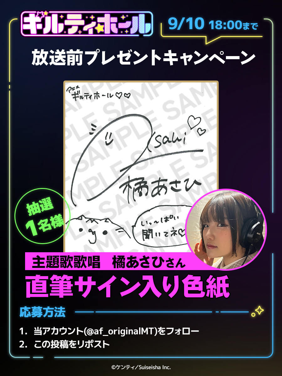 公式X(旧Twitter)では、放送前キャンペーンとして<橘あさひさん直筆サイン入り色紙>を抽選で1名様にプレゼントするキャンペーンを実施しております。